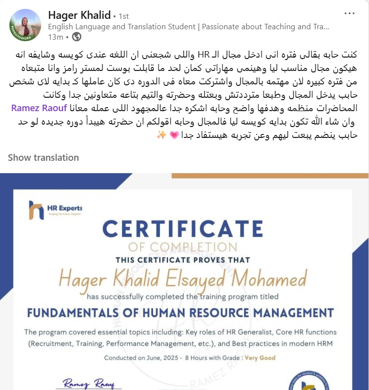 - محاضر دولى واستشارى بخبرة عملية أكتر من 14 سنة في مجال ال HR وفى تدريسه من خلال كبرى شركات التدريب.