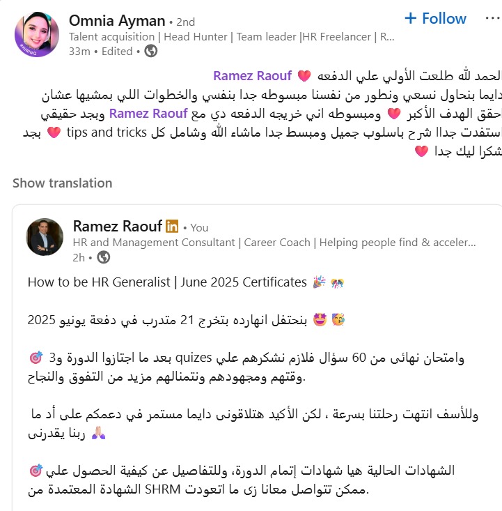 - مؤسس شركة HR Experts للإستشارات و مؤسسة كوتشينج للتدريب.
